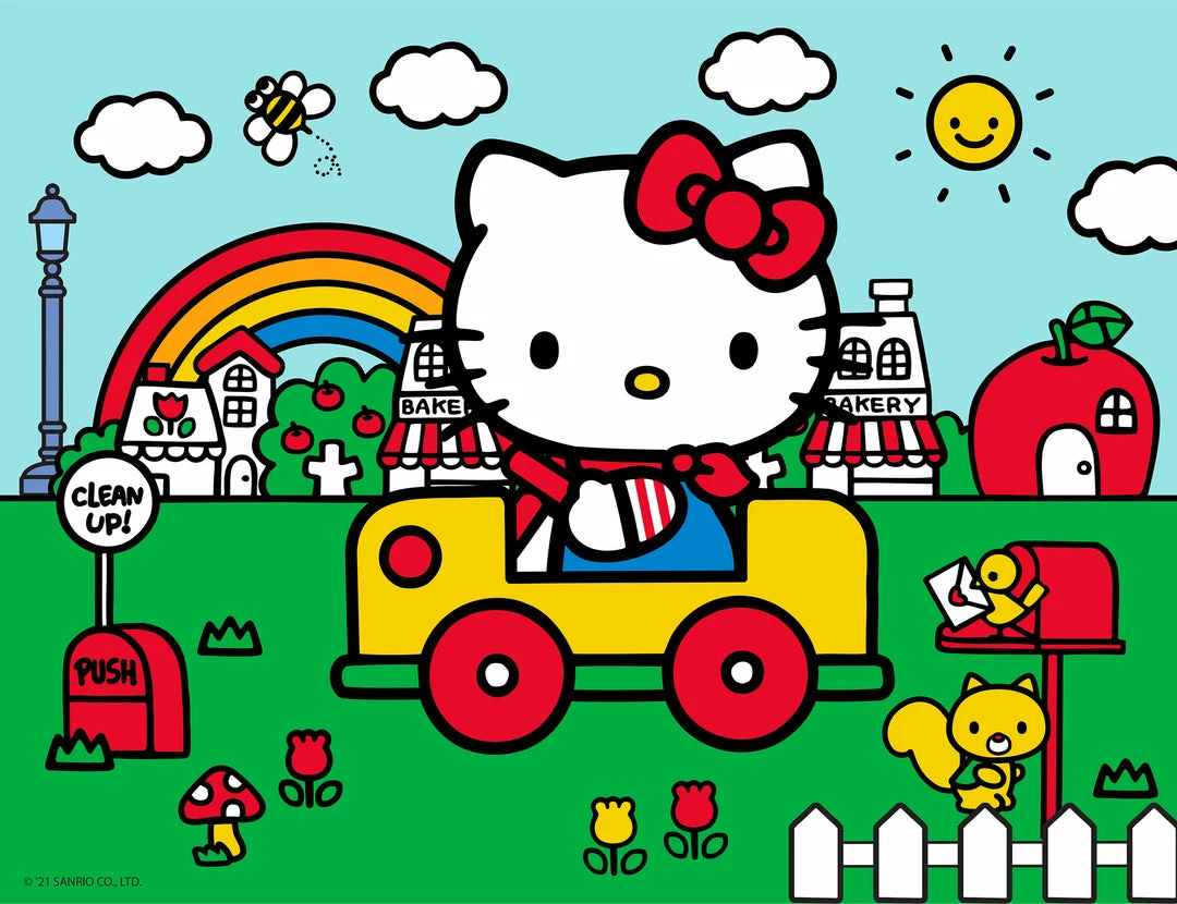 So cute! This 100-piece jigsaw puzzle features Hello KittyΒ driving an adorable yellow car through town.Β Full of rich colors and fun details, this puzzle is perfect for a leisurely weekend indoors.