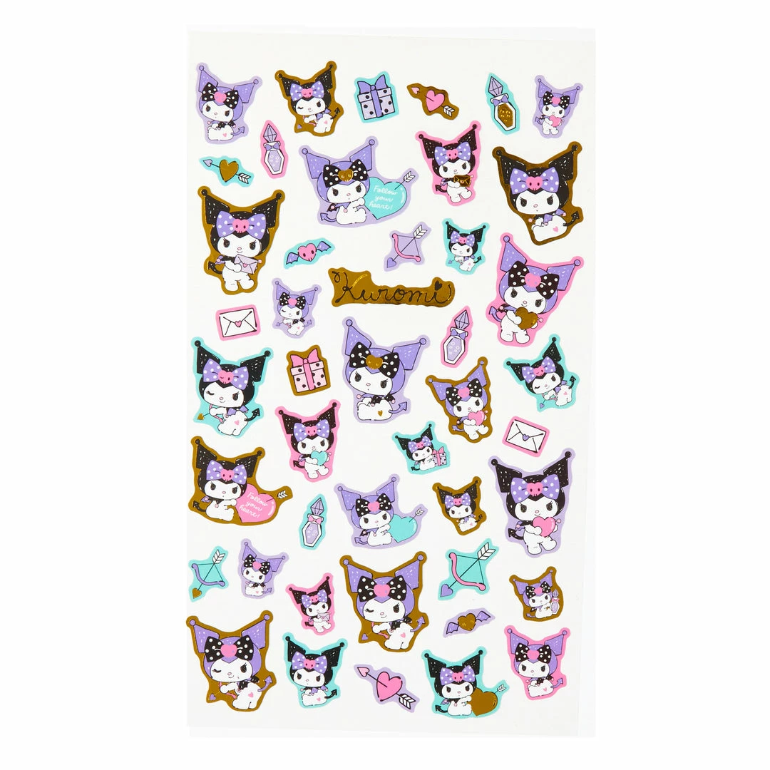 Rep your favorite Sanrio characters with these sticker sheets! Each has a select handful of individual stickers outlined in metallic gold for a luxe and glitzy finish. This sheet featuresΒ Kuromi wearing a big, polka-dotted black bow!