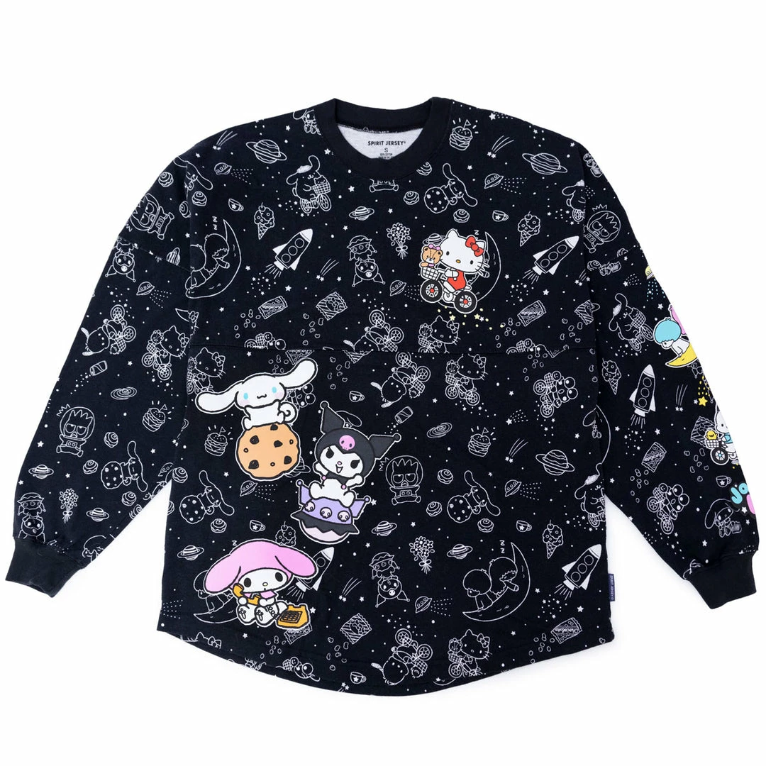 This Hello Kitty & Friends JapanLA Spirit Jersey features a black and white all over print fabric. On the front chest, Hello Kitty is riding her bike with her friend Tiny Chum. Also printed on the front are Cinnamoroll, Kuromi, and My Melody floating in space. The upper back features Hello Kitty and Friends printed across the shoulders using puff metallic silver foil. On the lower back is a large graphic of Keroppi, Pompompurin, and Badtz-maru floating through the cosmos.
