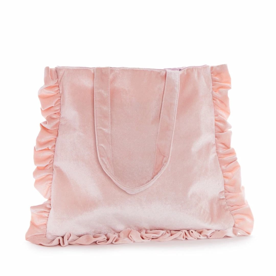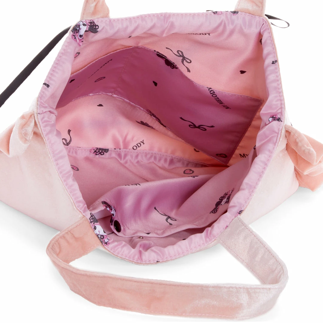 The statement piece of the MeloKuro series, this blush velvet tote bag is trimmed with a ruffled edge and character embroidery at the bottom center. Finished with two black ribbons, an interior pocket, and patterned lining, it’s one of the loveliest totes we’ve seen yet.