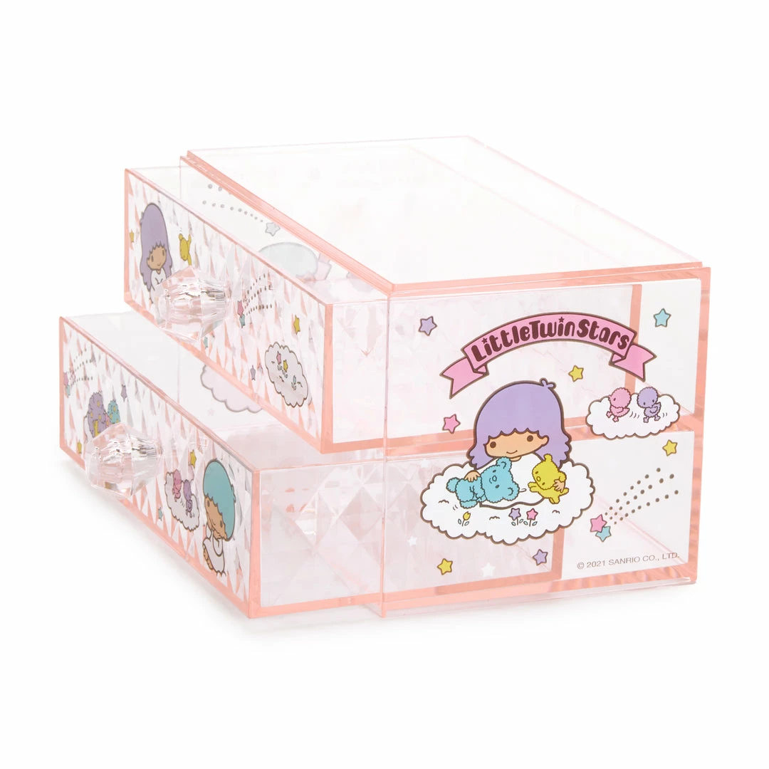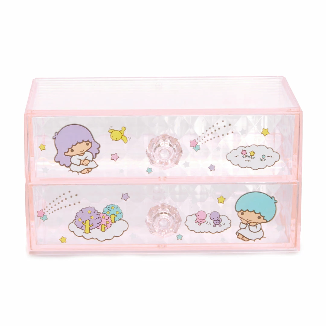 Keep your work station cute and tidy using this two-drawer, acrylic desk organizer. Though clear, it has a colored tint with artwork on all the sides! The knobs are matching faux gem stones. Keep pens, little notes, or whatever else you need in close reach!Β