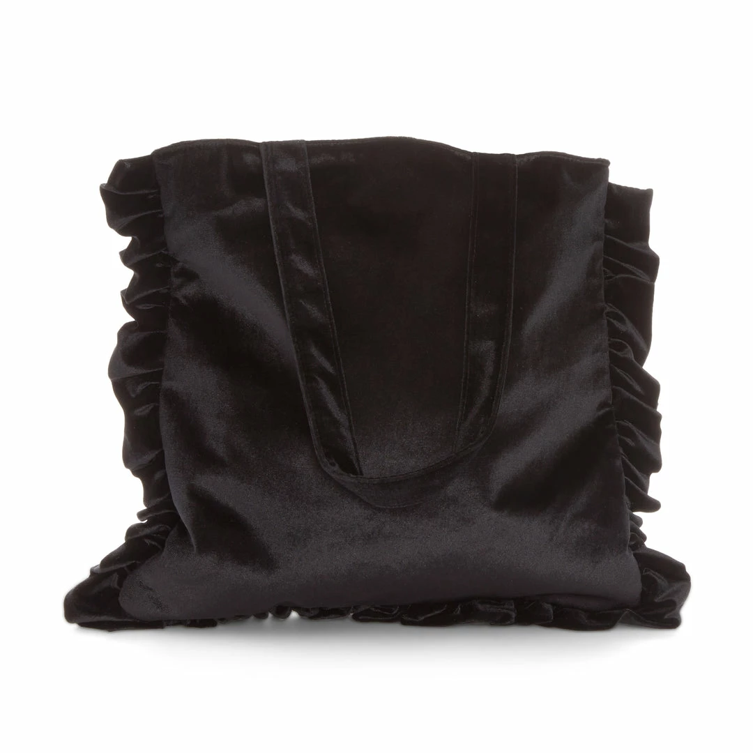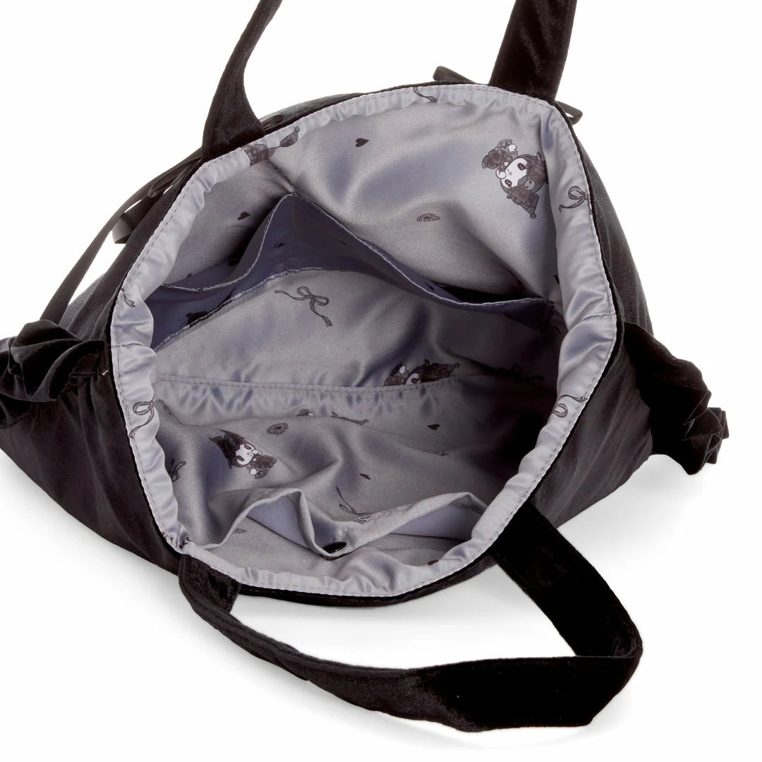 The statement piece of the MeloKuro series, this black velvet tote bag is trimmed with a ruffled edge and character embroidery at the bottom center. Finished with two black ribbons, an interior pocket, and patterned lining, it’s one of the loveliest totes we’ve seen yet.