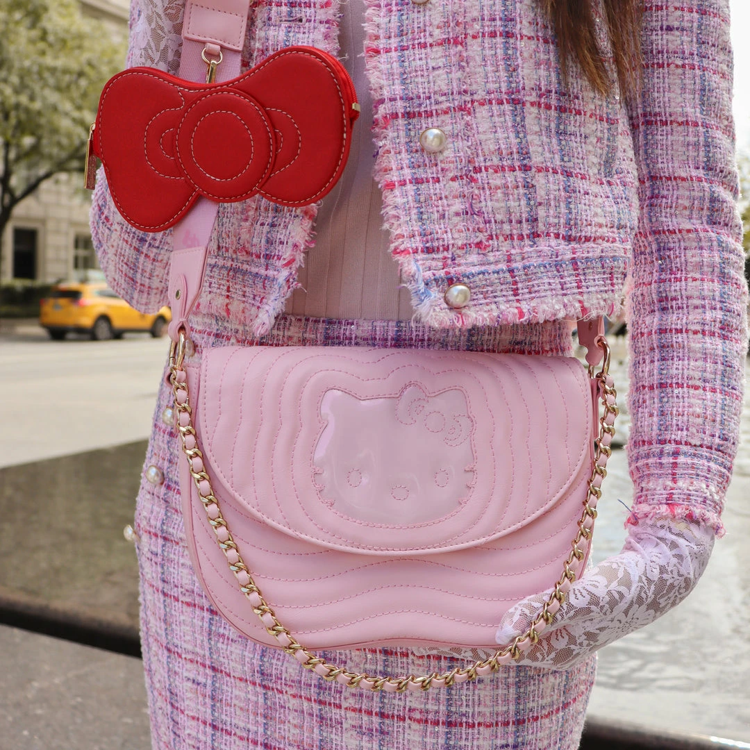 Oh so chic! This quilted crossbody and coin purse is for all the it-girls and it-boys. Done in theΒ perfect pastel pink shade, with quilted material, and Hello Kittyβs face embroidered in pink stitching. Featuring an adjustable webbed strap with Hello Kittyβs signature, a red oversized bow coin purse, and gold chain details, this crossbody will go with all your looks.