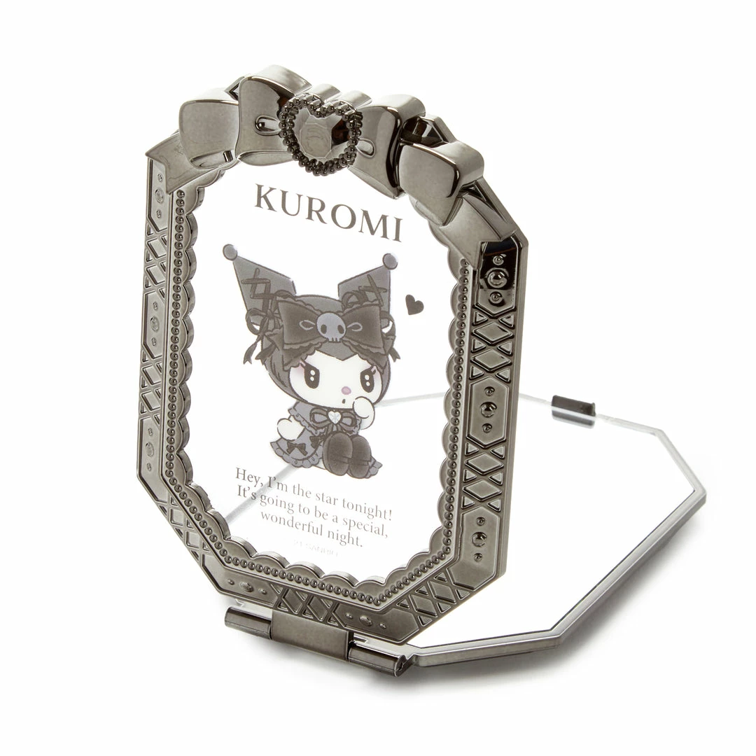 With a chrome-like gunmetal finish, this folding compact mirror is perfect for die-hard Kuromi fans. Moody and romantic, it features a clear cover with Kuromi artwork and an embossed heart with wings on the back with the words, “A special friend, a special night.”