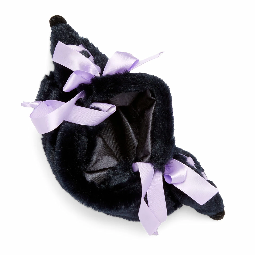 Keep your trinkets in this adorable drawstring bag. It has Kuromi’s ears braided with lavender ribbons.Β Her eyes have little hearts and she has her mouth agape in a worried expression.