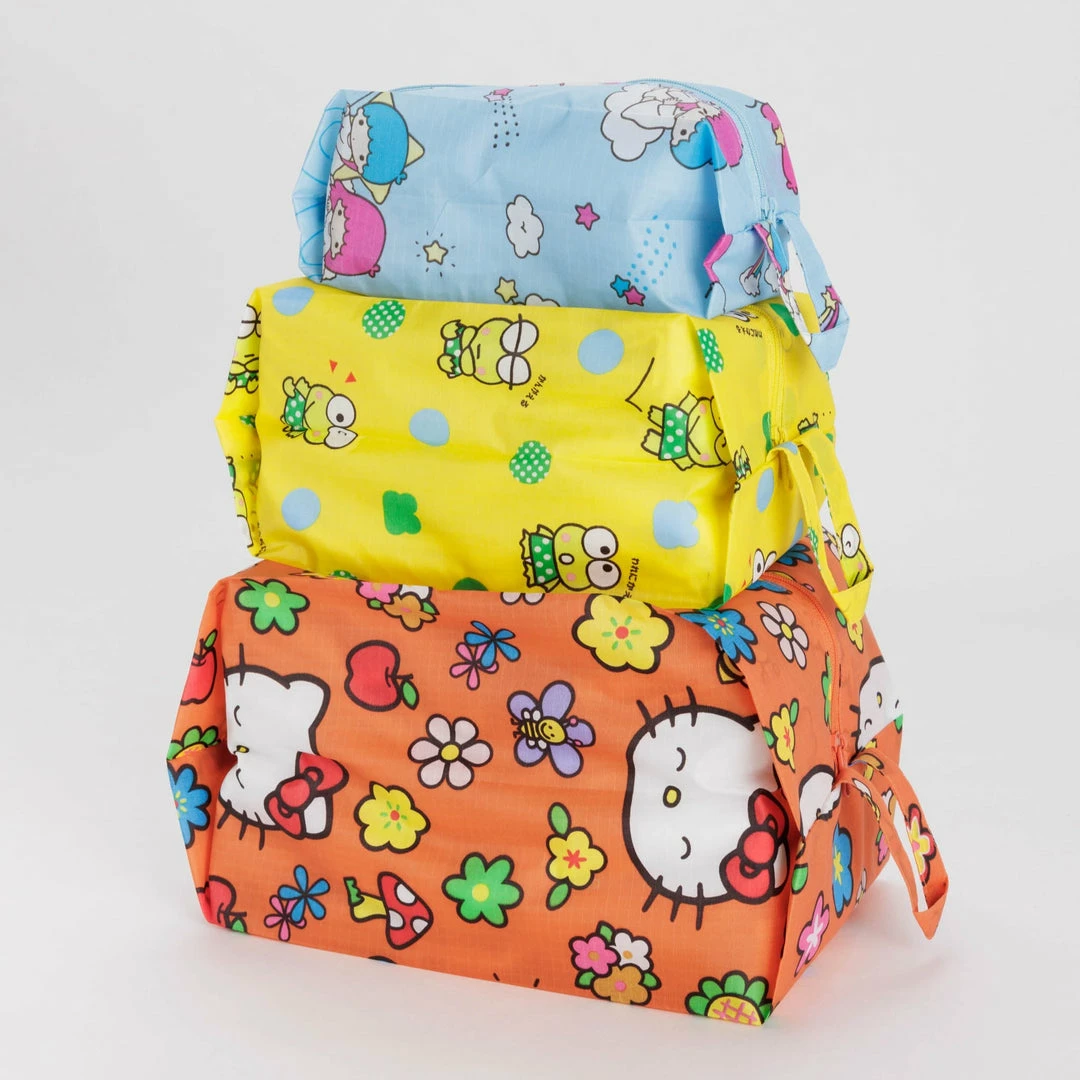 A set of three zippered pouches for travel and organization, with loops for carrying and hanging on the go. Perfect for packing, organizing your bag, or home tidying.