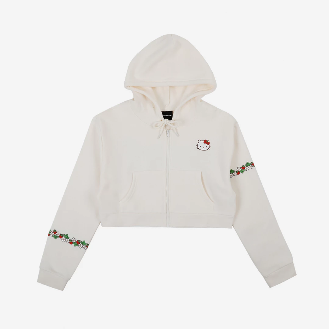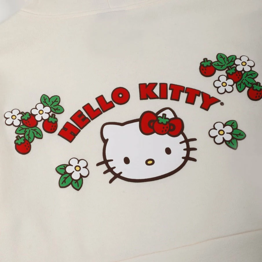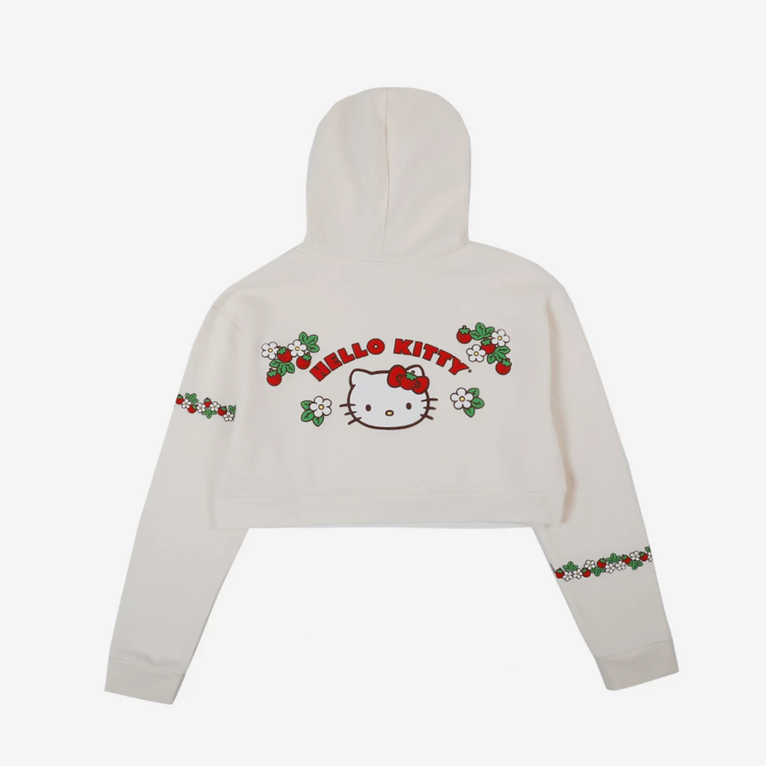 This cropped, zip-front hoodie is berry cute! It has a strawberry blossom design along each sleeve with a large Hello Kitty graphic at the back. Pair it with the matching Hello Kitty Strawberry Tee for a complete look.