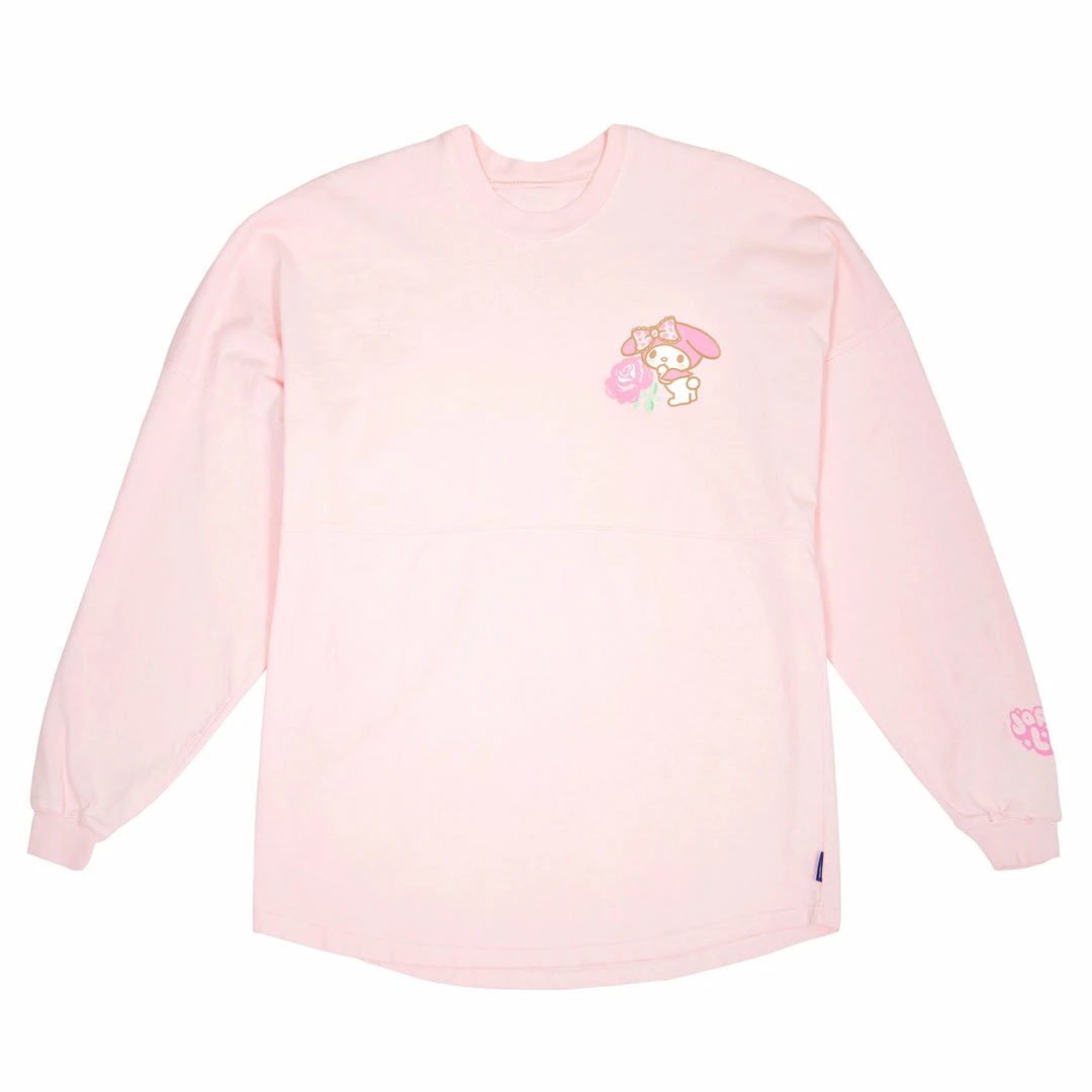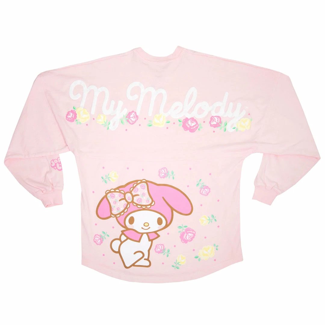 This My Melody JapanLA Spirit Jersey features a light pink unisex Spirit Jersey top with puff printing of My Melody and a pink rose on the front. On the upper back, My Melody’s name is printed using white super puff and glitter. On the lower back is a large graphic of My Melody surrounded by pink and yellow glitter roses! The JapanLA Logo is printed on the left sleeve.
